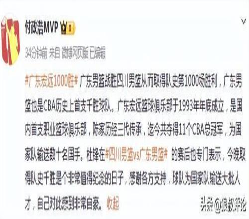 广东主帅杜锋采访当中谈到第1000胜的话题表示: