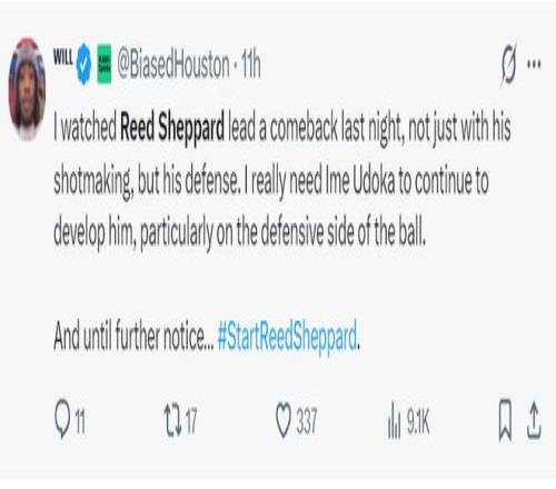 火记Will:昨晚我们看到了谢泼德的强势反弹,不仅表现在投篮技术上还有防守,我觉得乌度卡应该提升他的培养力度,尤其是继续帮他提升防守。